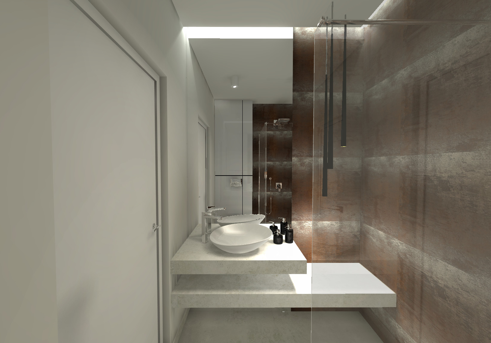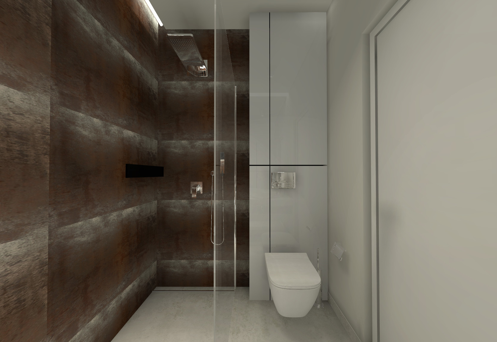 Natomiast w mniejsze łazience postawiono na nowoczesność i bardziej surowe pomieszczenie. Na uwagę zasługują tutaj płytki imitujące rdzę oraz prysznic z kabiną walk-in i odpływem liniowym w podłodze.