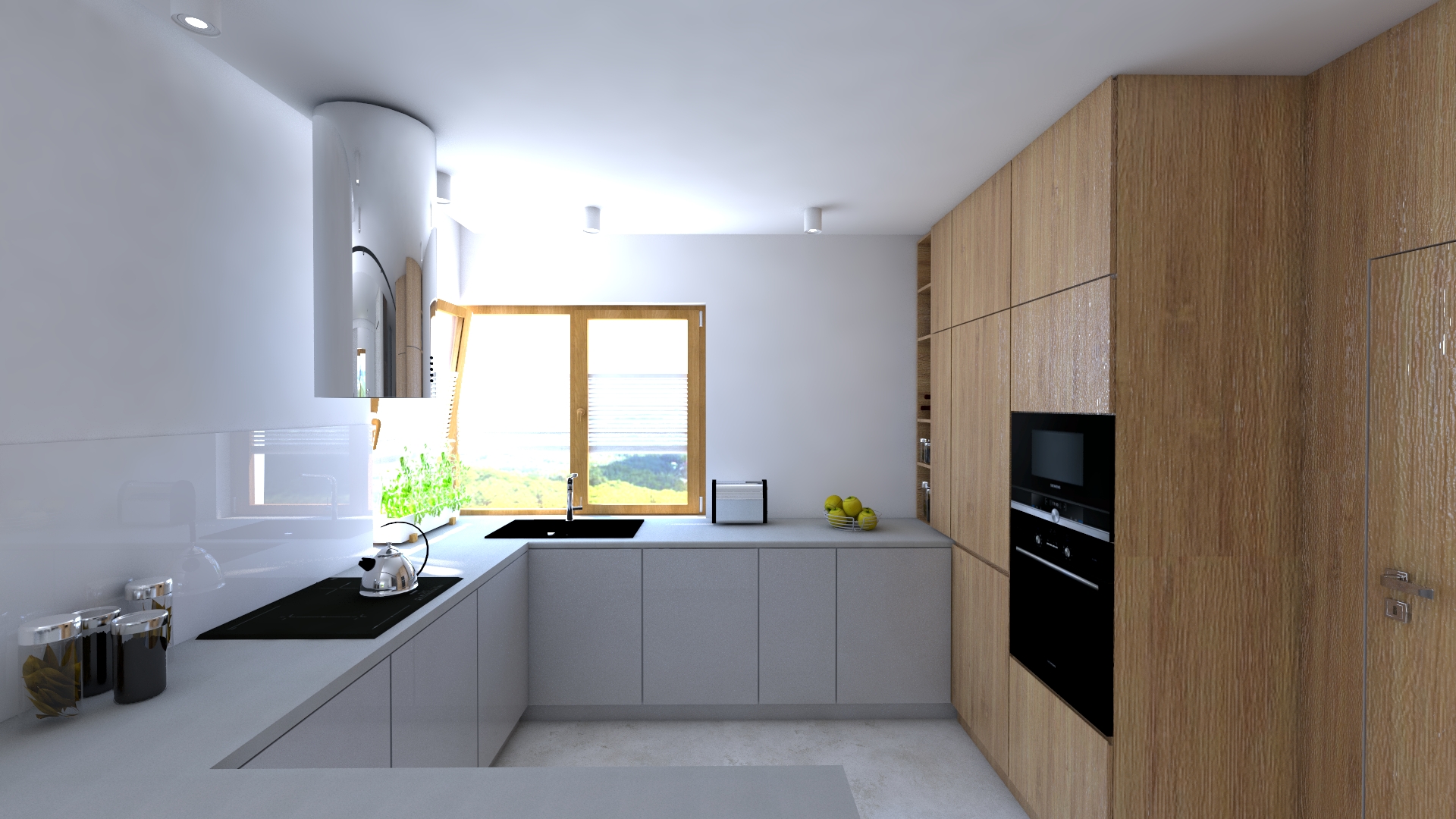 We wnętrzu zastosowana nowoczesne materiały, takie jak rdzawe płytki, czy fornir o strukturze drewna. W otwartej na salon kuchni znajduje się także wejście do spiżarni.